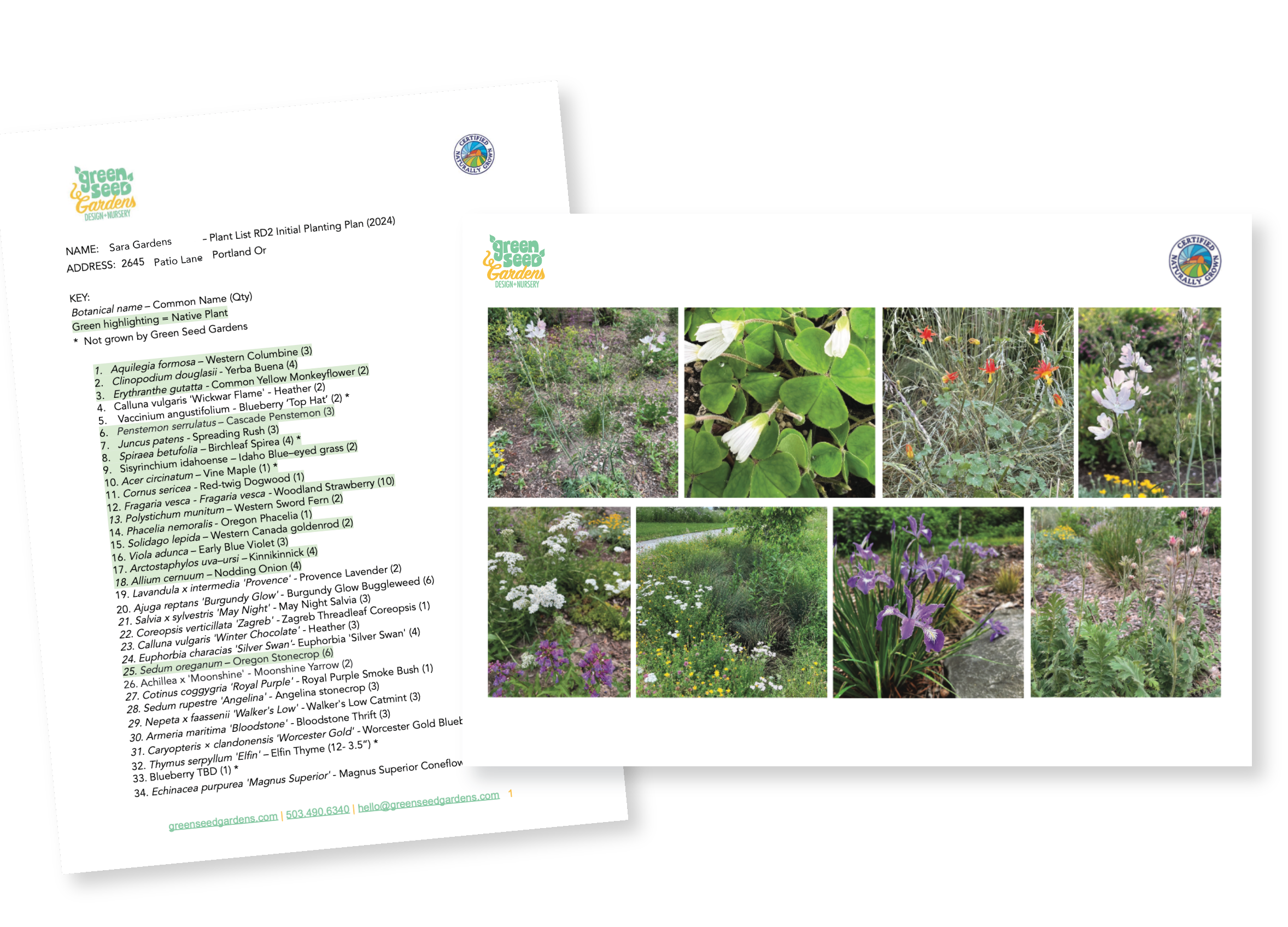 We design primarily from our own Certified Naturally Grown nursery which produces several hundred varieties of plants well adapted to our climate. Our nursery is unique in that we grow without any synthetic pesticides or fertilizers. We love plants of all types and grow many wonderful perennials, ground covers, grasses, shrubs and natives. However, we can’t grow everything, so we often fill in from other nurseries for a small portion of the plants in our designs. We offer procurement services for plants we do not grow such as trees or customer special requests. If something is out of stock, we can usually suggest an alternative or we can add it to the procurement list if the exact plant in the design is desired.